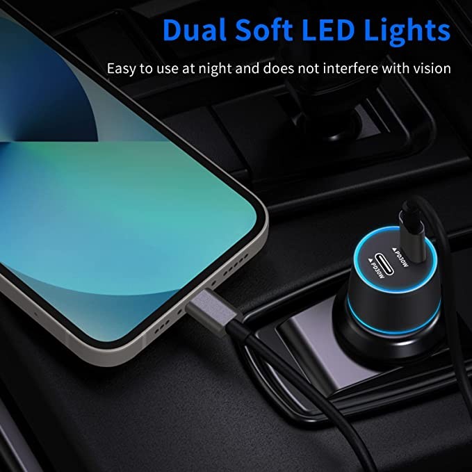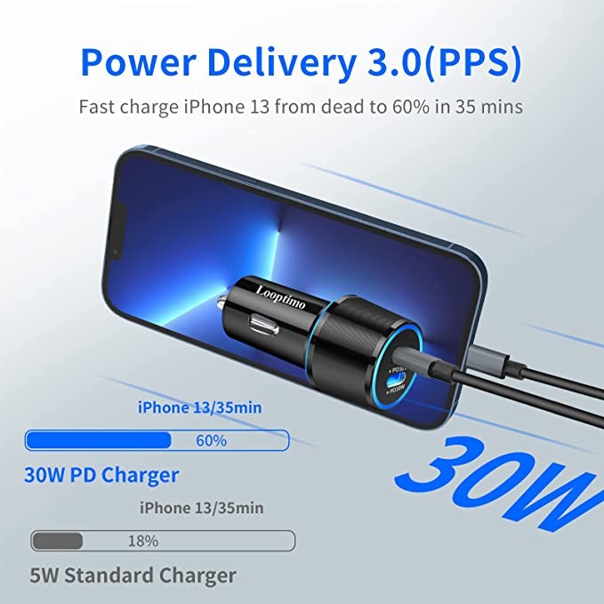 Dual 30W USB C car charger for fast charging, Looptimo 2-piece 60W C-type fast car adapter, PD (PPS) 3.0 port Cargador para Carro compatible with iPhone, Samsung Galaxy, Google Pixel phones