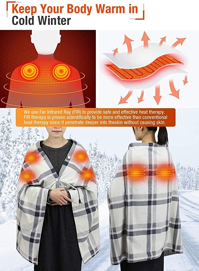 Heated cape blanket, portable wearable 5V USB electric heating cloak, home, office, car, camping, fish, picnic, sports, football, concert, 55x32 inch