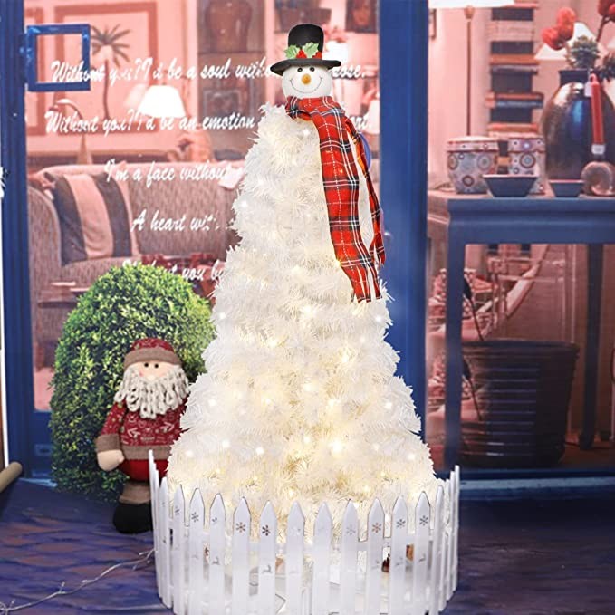 Package Includes: 1 x White Christmas Tree, 1 x Snowman Tree Topper, 3 x Plastic Tree Stand
