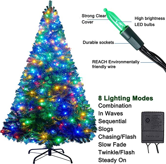 Lulu Home 6 Ft Artificial Christmas Tree with 300 LED Warm White String Lights (Not Pre-Strung) and 850 Branch Tips, 8 Lighting Modes Artificial Christmas Tree with Iron Stand